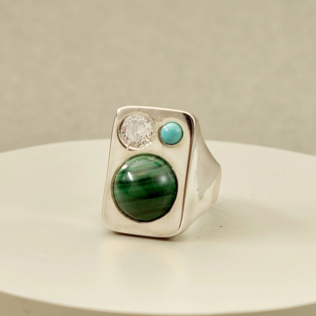 Anillo hecho a mano en plata 925 con un diseño armónico y poderoso, que combina malaquita, turquesa y cubic zirconia en cabujones naturales. Cada piedra fue elegida por su energía vibrante y su belleza única, creando una joya que expresa conexión con la Tierra, protección y expansión del corazón.