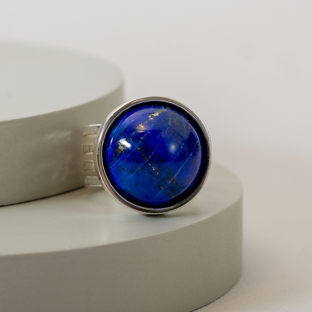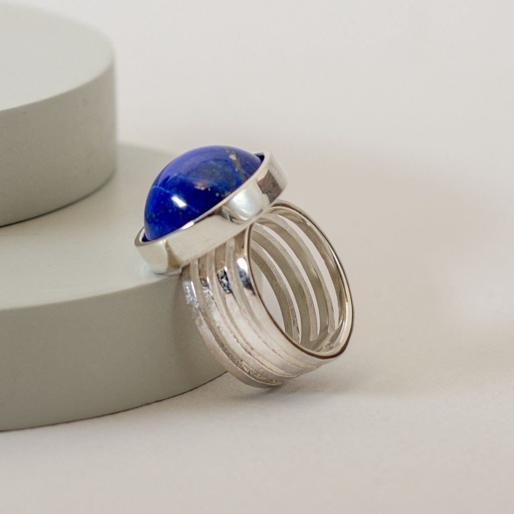 Anillo hecho a mano en plata 925 con rulos de diseño orgánico que envuelven un cabujón de lapislázuli. Su estética escultórica y mineralidad profunda hacen de esta pieza un amuleto elegante y protector.