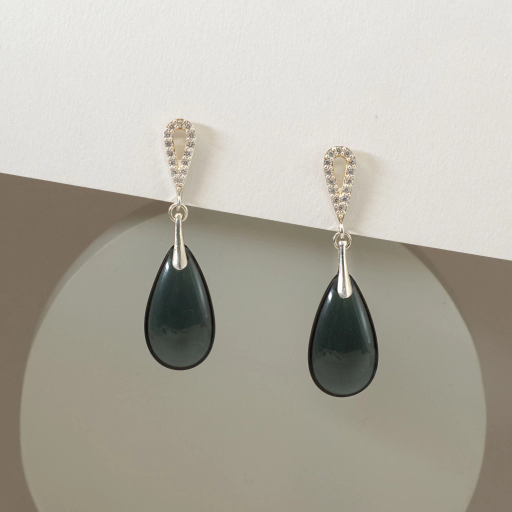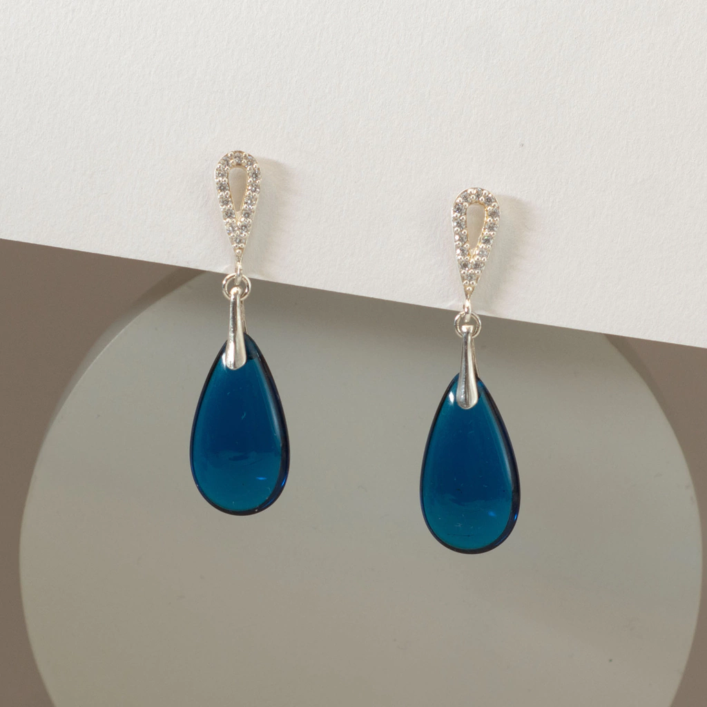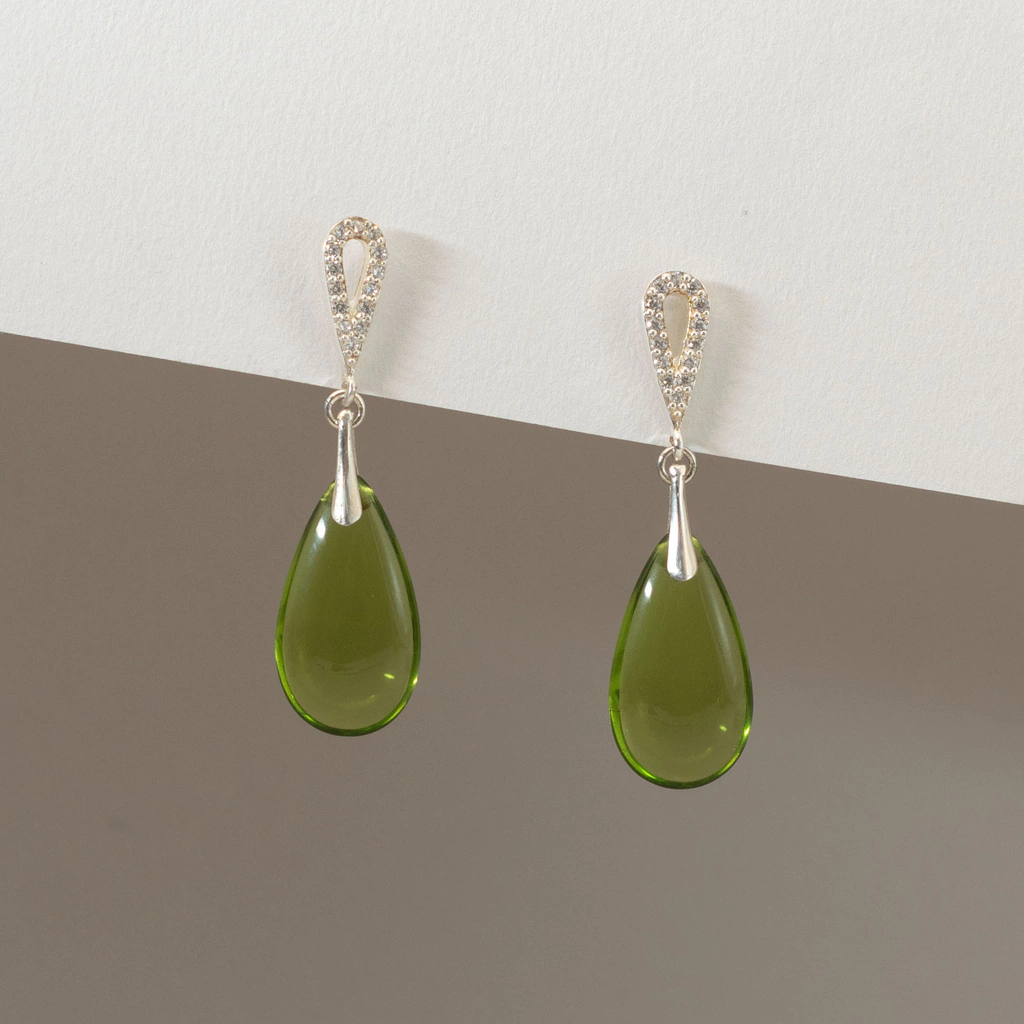 Aros hechos a mano con base de plata 925 con cubic circonia, acompañados por una gota checa disponible en cuatro variantes de color: verde esmeralda, verde peridoto, azul zafiro o azul humo. Una joya delicada y con movimiento, pensada para expresar tu luz con el color que más conecte con tu energía.