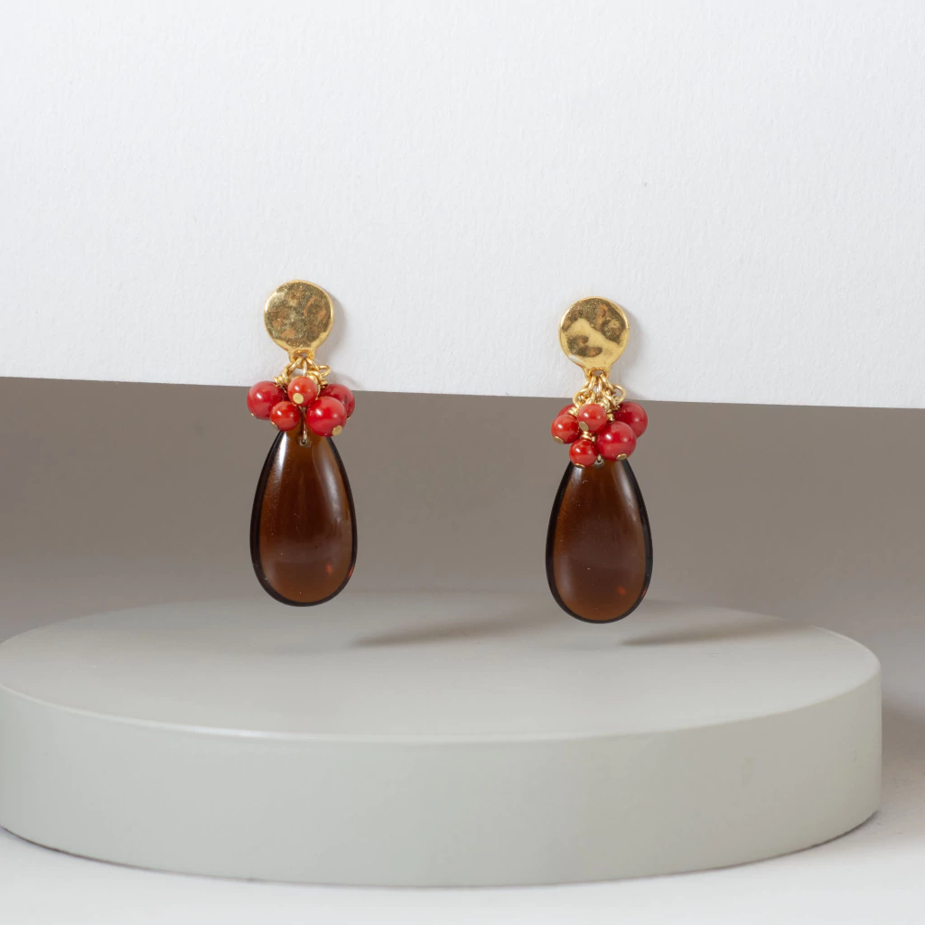 Aros hechos a mano en vermeil (plata bañada en oro) con gota checa color topacio y racimo de coral rojo natural. Un diseño cálido y vibrante que combina alegría, energía y una elegancia luminosa.