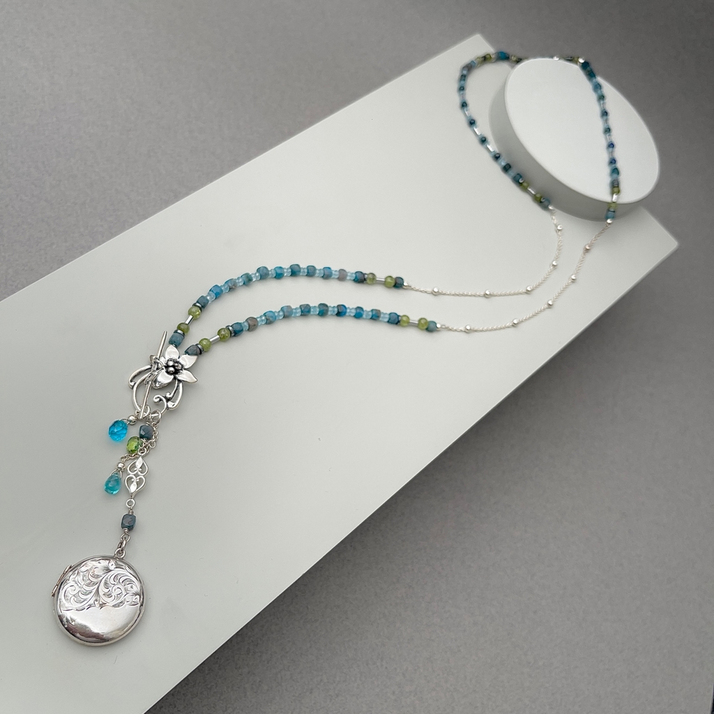 Collar largo confeccionado con broche central y cadena de plata 925, con apatita, aguamarina, crisocola y peridoto.