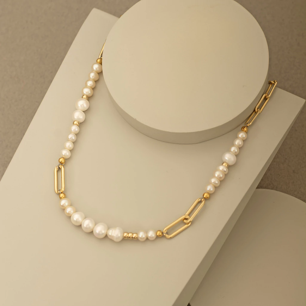 Collar corto hecho a mano con cadena bañada en oro, cuentas de goldfilled y perlas naturales. Su diseño asimétrico, elegante y luminoso lo convierte en una pieza versátil y sin género, ideal para llevar con estilo propio y energía sutil.