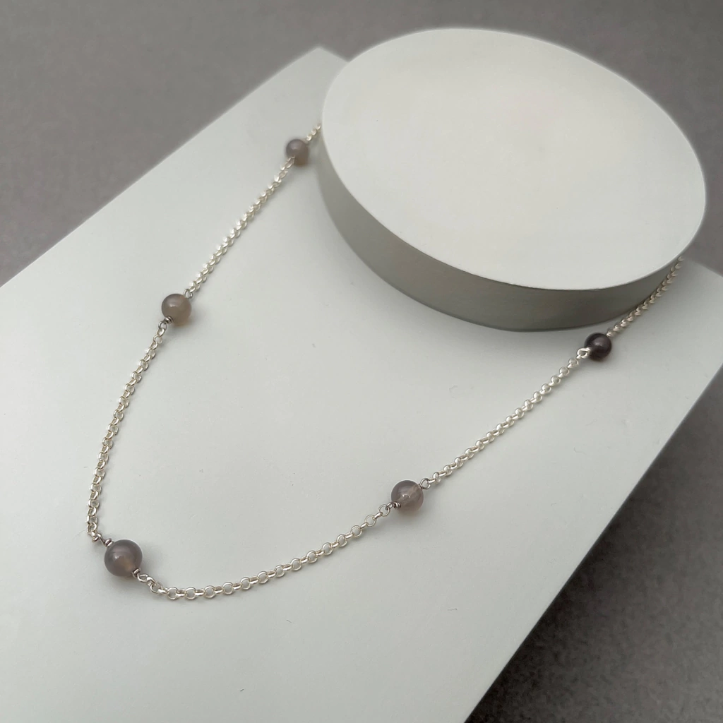 Collar hecho a mano con cadena de plata 925 y piedra natural de ágata gris. Un diseño sobrio y delicado, ideal para quienes buscan una joya versátil, sutil y con profundidad energética. Su medida corta lo convierte en un accesorio perfecto para usar todos los días o en capas con otros collares.