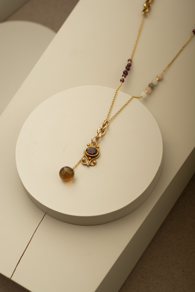 Collar hecho a mano con cadena de goldfilled, granates, moonstone de reflejos suaves y un dije central de plata bañada en oro, con un granate engarzado y una gota de topacio. Este diseño versátil puede usarse largo o con dos vueltas al cuello, adaptándose a diferentes estilos y momentos.