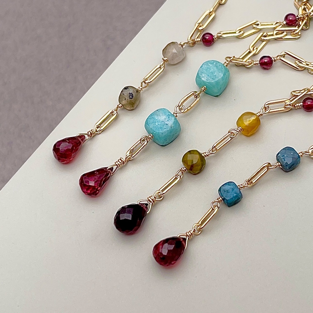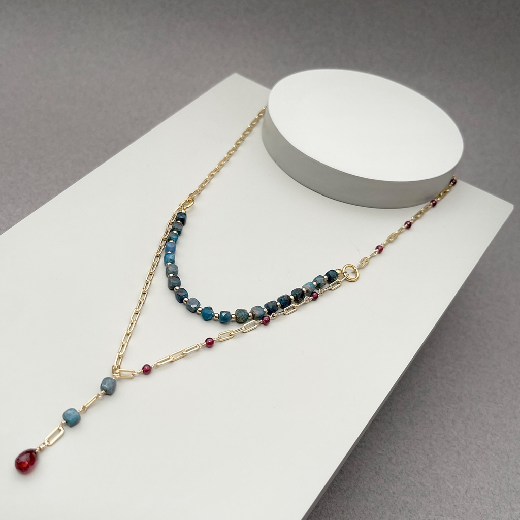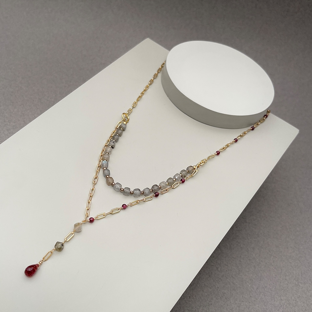 Collar doble corbatero con cadena de bronce bañado en oro y granates con agata amarilla y hematite dorado